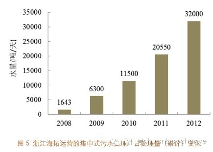 浙江海拓環(huán)境技術(shù)有限公司作為第三方運營公司的代表,近幾年其運營規(guī)模以每年翻番的速度增長。浙江海拓環(huán)境技術(shù)有限公司成立于2007年9月17日,2008年公司營業(yè)額為約400萬元,2012年公司營業(yè)額約為1.6億元。調(diào)查發(fā)現(xiàn),海拓環(huán)境目前對浙江省12個電鍍園區(qū)及企業(yè)進行第三方運營,總運營規(guī)模達到4萬噸/天(設(shè)計規(guī)模)(圖5)。由此可見,電鍍污染物排放標準的頒布對第三方運營公司的發(fā)展起到了積極的促進作用。而隨著各地區(qū)對標準實施的嚴格要求及整治力度的加強,第三方運營企業(yè)的數(shù)量及規(guī)模也將呈現(xiàn)出快速發(fā)展的特點。