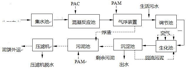 本工藝采用物化和生化相結(jié)合的方式。廢水首先通過(guò)格柵去除廢水中的大粒徑顆粒物,以保證后續(xù)工段的安全、穩(wěn)定運(yùn)行。在生產(chǎn)廢水中含有大量的乳化油,故先加入適量的PAC(聚合氯化鋁)對(duì)其進(jìn)行破乳,產(chǎn)生細(xì)小礬花,再加入PAM充分混合產(chǎn)生更大的礬花,再氣浮池內(nèi)利用渦輪攪拌產(chǎn)生的大量細(xì)小氣泡的吸附、頂托、裹夾作用使礬花浮上水面,與污水分離。水面上的浮渣通過(guò)刮渣機(jī)刮渣進(jìn)入污泥池中,預(yù)處理后的生產(chǎn)廢水排入廠區(qū)污水管網(wǎng)中,然后與管網(wǎng)中的生活污水一同進(jìn)入調(diào)節(jié)池中,停留足夠長(zhǎng)時(shí)間使污水的水質(zhì)得到均化,同時(shí)在24小時(shí)內(nèi)調(diào)節(jié)污水的水量,保證后續(xù)生化處理的連續(xù)穩(wěn)定的運(yùn)行。調(diào)節(jié)池中的廢水通過(guò)提升泵提升進(jìn)入生化池。在生化池中,通過(guò)生長(zhǎng)在填料上的微生物自身的新陳代謝對(duì)污水中的污染物質(zhì)進(jìn)行吸收分解利用,從而使污水得到進(jìn)化,老化的生物膜在水流沖刷作用下脫落并隨水流進(jìn)入沉淀池,在沉淀池中,利用泥、水重力的不同使泥水分離開(kāi),上清液排放進(jìn)入城市污水管網(wǎng)中,下層污泥通過(guò)空氣提升所用部分回流到生化池中,剩余部分排入污泥池中。污泥池中的污泥在加藥調(diào)理改善其脫水性能后通過(guò)螺桿泵泵入壓濾機(jī)中,通過(guò)壓濾機(jī)的作用降低污泥的含水率,使污泥能夠便于外運(yùn)處置。在生化池中不斷通入空氣曝氣,以保證污水中溶解氧的濃度,使微生物能夠正常的生長(zhǎng)。