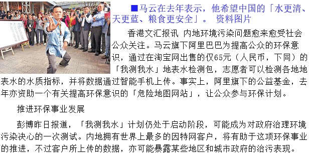 馬云通過(guò)大自然協(xié)會(huì),支持“我測(cè)我水”的活動(dòng),再次祭出“價(jià)值觀+人民戰(zhàn)爭(zhēng)”的殺手锏,據(jù)香港文匯報(bào)的報(bào)道,這個(gè)行為傳遞了這樣的信號(hào):“是的,你可以檢測(cè)這些東西,你有權(quán)檢測(cè)你喝的水以及呼吸的空氣中都有些什么”,并有權(quán)要求政府采取行動(dòng),這是一個(gè)非常強(qiáng)的信息。筆者詳細(xì)的了解了“我測(cè)我水”的檢測(cè)包,檢測(cè)內(nèi)容包含了pH,大腸桿菌,余氯等指標(biāo),應(yīng)該說(shuō),涵蓋了水質(zhì)的安全范圍,但從易操作性來(lái)看,仍有大幅的改進(jìn)空間,所以目前從“我測(cè)我水”的網(wǎng)站來(lái)看,目前上傳的數(shù)據(jù)并不算多,也可能是這項(xiàng)活動(dòng)仍在起步階段。