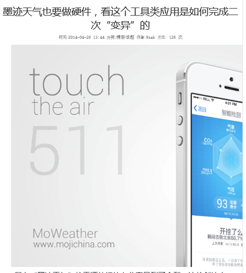 墨跡天氣據(jù)說(shuō)用戶量以億級(jí)來(lái)衡量,目前也開(kāi)始進(jìn)入硬件市場(chǎng),據(jù)悉,這款產(chǎn)品將采用金屬外觀,工藝類似MacbookPro外殼,機(jī)身簡(jiǎn)潔充滿藝術(shù)感。除了檢測(cè)PM2.5,還將提供氣壓、溫度、空氣濕度以及二氧化碳含量。從宣傳圖片不難看出,產(chǎn)品頂部還帶有LED顯示功能。海爾的水質(zhì)盒子也是同樣的道理,以為客戶提供凈水機(jī)管理服務(wù)為切入點(diǎn),進(jìn)而掌握客戶家中飲用水的質(zhì)量。