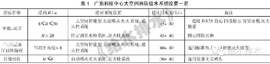 廣東科學中心大空間消防給水設計,根據(jù)施工設計時的現(xiàn)行規(guī)范,除采用傳統(tǒng)的消火栓系統(tǒng)外,同時《自動噴水滅火系統(tǒng)設計規(guī)范》GB50084-2001、《固定消防炮滅火系統(tǒng)設計規(guī)范》(GB50338—2003)和廣東省標準《大空間智能型主動噴水滅火系統(tǒng)設計規(guī)范》(DBJ15-34-2004),采用自動噴水滅火系統(tǒng)、固定遠控消防炮、自動掃描射水高空水炮和標準型大空間智能滅火裝置,消防給水系統(tǒng)設置見表1。
