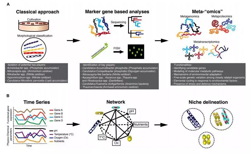 宏基因組學的研究很大程度上促進了我們對于有益菌種群體功能的了解,比如宏蛋白質組學、環(huán)境轉錄組學以及二者之間的聯(lián)系,使得我們對不同環(huán)境條件下(如好氧/厭氧階段)關鍵過程中的相關基因的具體表現(xiàn)形式有了進一步的了解。因此,在時間和空間上整合“生物組學”,并與物理化學參數(shù)相結合,便可重新構建與界定生態(tài)網(wǎng)絡和有機生態(tài)位。這些信息可能是鑒別微生物群體結構與功能的關鍵的決定性因素,可以用于從污水中進行綜合的能源和資源回收。