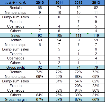 Ø Rentals為公司的租賃業(yè)務(wù),Memberships為公司租賃期到之后的服務(wù)業(yè)務(wù),Lump-sum為一次性收入,Export出口產(chǎn)品,Cosmetics為化妝品業(yè)務(wù)。