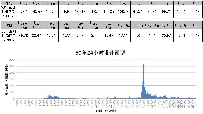 1)設(shè)計雨型采用最小時間段為5min、最大時間段為1440min的北京市設(shè)計雨型,分配過程詳見附錄A