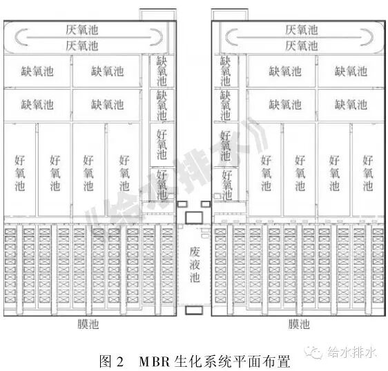 2 M BR 膜池, 位于改良型A2/ O 生化池的后端, 對生化后污水進行泥水分離。本工程采用聚偏氟乙烯( PVDF) 中空纖維簾式膜, 設計膜通量為14. 5 L/ ( m2 . h) , 膜孔徑<=0. 1 微米, 共設20 個膜處理單元, 每單元設10 個膜組件。MBR 生化系統(tǒng)平面布置見圖2。2. 4. 4 MBR 生化系統(tǒng)設備間
