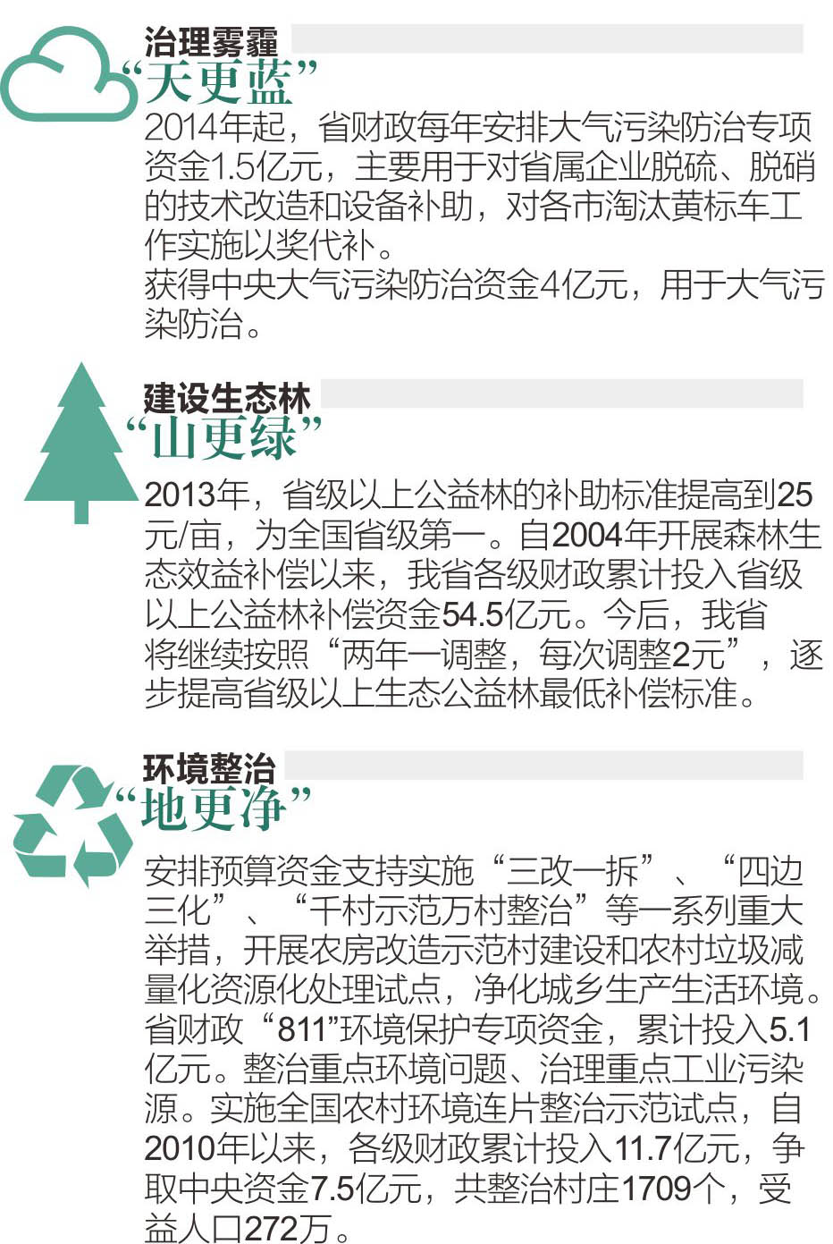 牢固樹(shù)立“綠水青山就是金山銀山”的發(fā)展理念,著力構(gòu)建全方位、立體化的生態(tài)財(cái)政政策體系。省級(jí)生態(tài)環(huán)保投入從2008年的36.78億元增長(zhǎng)至2013年的68.2億元,年均增長(zhǎng)13.14%。