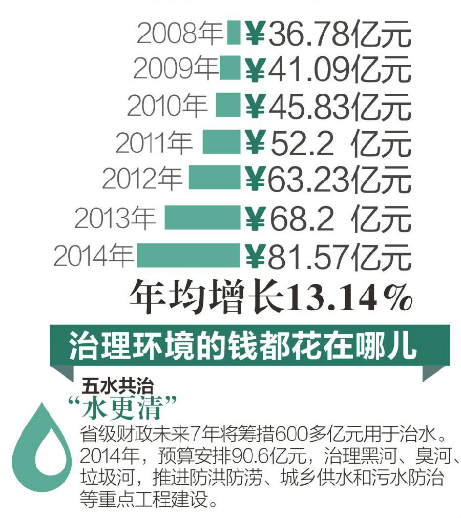 加強(qiáng)對(duì)“五水共治”的政策和資金保障,省級(jí)財(cái)政未來(lái)7年將籌措600多億元用于治水。2014年,預(yù)算安排90.6億元,支持黑河、臭河、垃圾河治理,推進(jìn)防洪防澇、城鄉(xiāng)供水和污水防治等重點(diǎn)工程建設(shè)。