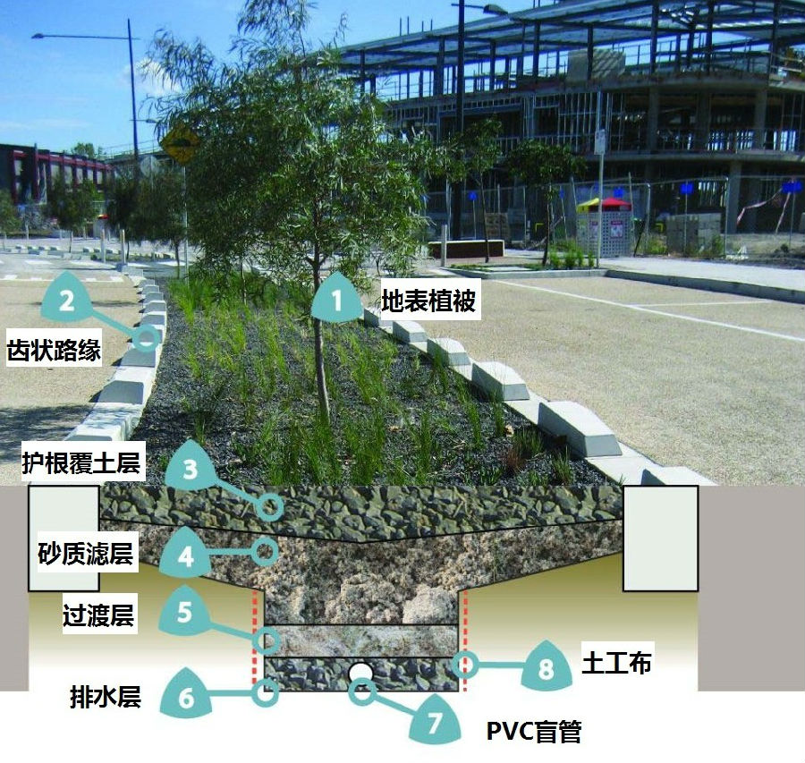工程實踐中采用的水量控制措施,主要包括透水鋪裝、下凹綠地、地下儲水池及雨洪滯蓄水庫(人工湖、雨洪公園)等;水質(zhì)處理措施主要包括道路雨水口截污裝置,植被緩沖帶、排水草溝、生態(tài)排水草溝,泥沙過濾裝置、泥沙沉蓄池、雨水花園、人工湖及人工濕地等。