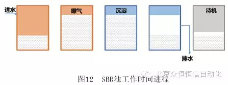 序批式活性污泥法(SBR)工藝是在時(shí)間上將厭氧段與好氧段進(jìn)行分割。20 世紀(jì)70 年代初由美國(guó)Irvine公司開發(fā)。它在流程上只有一個(gè)基本單元,集調(diào)節(jié)池、曝氣池和二沉池的功能于一池,進(jìn)行水質(zhì)水量調(diào)節(jié)、微生物降解有機(jī)物和固液分離等。經(jīng)典 SBR 反應(yīng)器的運(yùn)行過程為:進(jìn)水→曝氣→沉淀→潷水→待機(jī)(如圖11、 12)。