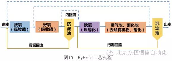 在AO-A2O工藝基礎(chǔ)上奧地利研發(fā)出了Hybrid工藝(如圖10),該工藝的兩段之間有三個(gè)內(nèi)回流裝置,可以為第一段曝氣池提供硝態(tài)氮、硝化菌以及為第二段曝氣池提供碳源。第一段主要是去除有機(jī)物和磷,第二段是硝化功能,并靠第一段曝氣池回流混合液進(jìn)行反硝化脫氮。