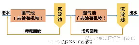 早期的兩段法只是將一套活性污泥法的兩組構(gòu)筑物串聯(lián),一段和二段曝氣池體積相同,且多合并建設(shè),大部分有機(jī)物在第一段被吸附降解,第二段的污泥負(fù)荷很低,其出水水質(zhì)要優(yōu)于相同體積曝氣池的單級(jí)活性污泥法(如圖7)。然而,由于第一段曝氣池體積減小了一倍,相當(dāng)于污泥負(fù)荷增加了一倍,處在易發(fā)生污泥膨脹的階段,運(yùn)行管理較為困難。