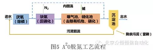 70年代,美國(guó)專家在A/O工藝的基礎(chǔ)上,再加上除磷就成了A2O工藝(如圖5)。我國(guó)1986年建廠的廣州大坦沙污水處理廠,采用的就是A2O工藝,當(dāng)時(shí)的設(shè)計(jì)處理水量為15萬噸,是當(dāng)時(shí)世界上最大的采用A2O工藝的污水處理廠。