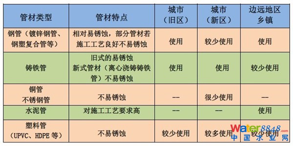 從全國(guó)范圍來(lái)看, 管材是各種各樣五花八門。從相對(duì)易銹蝕的鋼管(鍍鋅鋼管, 鋼塑復(fù)合管等)、舊式鑄鐵管,到不易銹蝕的銅管、不銹鋼管乃至塑料管,在城市舊區(qū)、新區(qū),以及鄉(xiāng)鎮(zhèn)地區(qū)都有不同的使用情況。