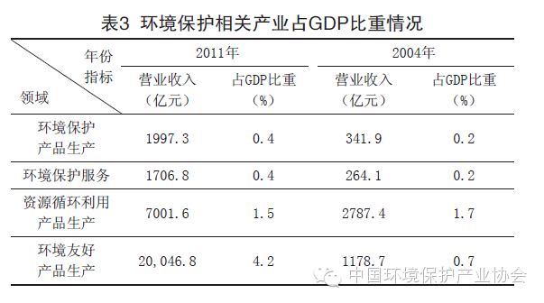 2004~2011年,我國(guó)環(huán)境保護(hù)相關(guān)產(chǎn)業(yè)營(yíng)業(yè)收入占同期GDP的比重大幅提升(見表3)。2011年,環(huán)境保護(hù)產(chǎn)品生產(chǎn)、環(huán)境保護(hù)服務(wù)、資源循環(huán)利用產(chǎn)品生產(chǎn)、環(huán)境友好產(chǎn)品生產(chǎn)的營(yíng)業(yè)收入占同期GDP的比重分別為0.4%、0.4%、1.5%、4.2%,2004年的占比分別為0.2%、0.2%、1.7%和0.7%。