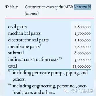 VarsseveldMBR出水水質(zhì)良好,但成本比其他水委會的污水廠高很多,傳統(tǒng)工藝每年的成本是€150,000 ($194,700),而MBR的成本€210,000 ($272,500),較傳統(tǒng)工藝+砂濾高25%。人工成本翻倍。