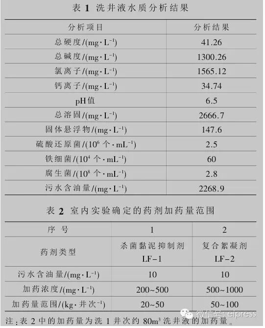 ②在洗井液水質(zhì)分析的基礎(chǔ)上,通過室內(nèi)實驗,優(yōu)選出的LF-1殺菌黏泥抑制劑和LF-2符合絮凝劑,能夠有效除菌,達到凈水目的。