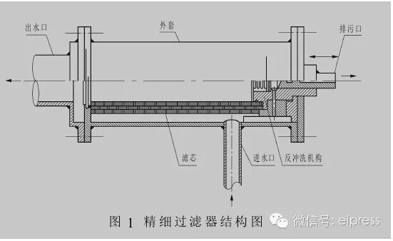 在注水井循環(huán)洗井技術(shù)研究過程中,配套研制出精細過濾器,該過濾器由三層不銹鋼管精細濾芯組成(見圖1),當洗井水通過管孔間交錯搭配形成的環(huán)隙時,洗井水中的機械雜質(zhì)與絮凝后的懸浮物被阻擋在旋流槽內(nèi),實現(xiàn)雜質(zhì)、懸浮物與洗井水的分離。精細過濾后的水進入中心管注入井內(nèi)。通過調(diào)整反沖洗機構(gòu),使濾芯進水孔與出水孔對位,反沖洗濾芯通道貫通,打開排污柄后,即可將過濾出的污物發(fā)沖洗出,從而實現(xiàn)排污和反沖洗功能。此外,通過調(diào)整環(huán)隙大小,可以達到不同注入水水質(zhì)標準要求,其精度可以達到0.002mm。