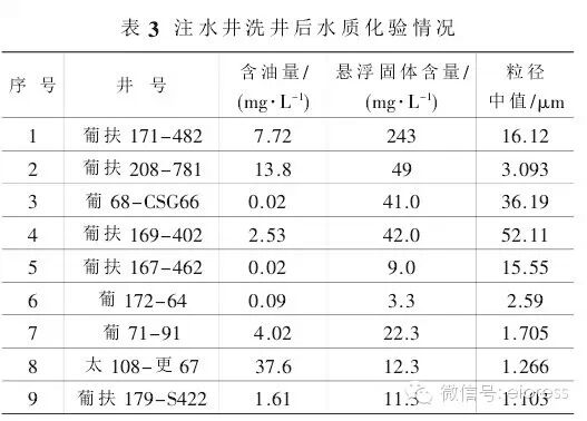 在現(xiàn)場應用過程中,隨機抽取注水井洗井后的水樣進行化驗,水中含油量、粒徑中值及懸浮物含量指標偶都有較大程度改善,基本能夠滿足注水井洗井要求(見表3)。
