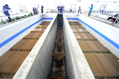 昨天,記者在郭公莊水廠機械加速澄清池車間看到,由12個碗狀澄清池構(gòu)成,每6個為一系列,分列于廠區(qū)西部的格柵間和提升泵房南北兩側(cè),是自來水常規(guī)處理的重要設(shè)施,主要去除水中的懸浮顆粒物。每個澄清池直徑為29米,深8米,池體容積2979立方米。按照混凝土結(jié)構(gòu)規(guī)范要求,機械加速澄清池環(huán)形集水渠和縱向集水槽的進水孔絕對高程誤差應(yīng)控制在±5毫米,而郭公莊水廠機械加速澄清池進水孔高程誤差控制在±2毫米,保證了每個系列機械加速澄清池負荷均衡、出水均勻。