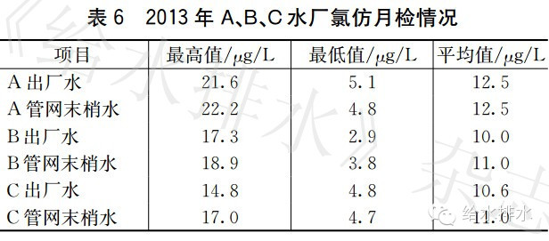 從表6數(shù)據(jù)分析,以化合氯形式出廠,到管網(wǎng)末梢水中氯仿增加很少,基本沒什么變化,均在控制范圍內(nèi)。