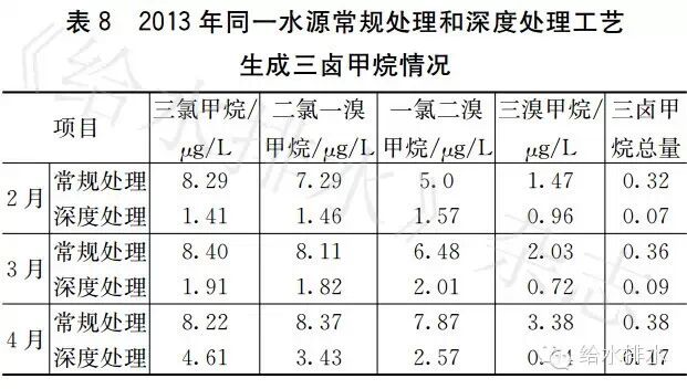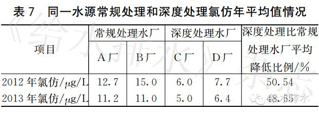 從表7可見,深度處理后氯仿要比常規(guī)處理工藝降低50%左右。