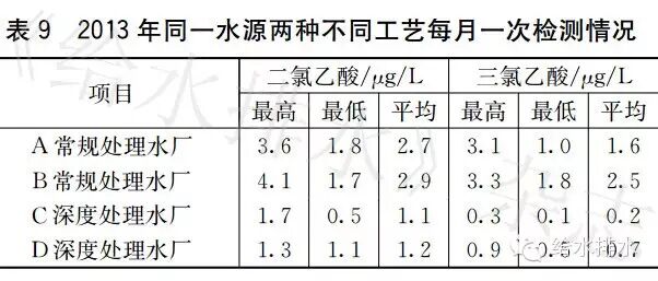 常規(guī)處理和深度處理工藝中二氯乙酸、三氯乙酸的變化、出廠水合格情況等應(yīng)引起關(guān)注。