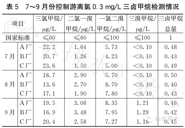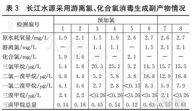(1)原水耗氧量較低時,可以采用游離氯消毒,從檢測數(shù)據(jù)看,采用游離氯消毒時三鹵甲烷總量比化合氯消毒高很多,但三鹵甲烷總量沒有超標(biāo)。