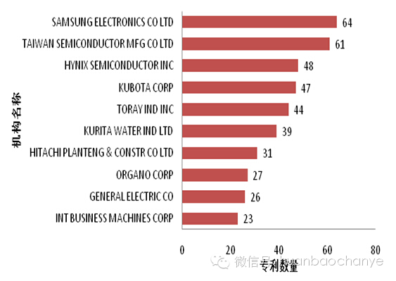 技術(shù)預(yù)測(cè)研究發(fā)現(xiàn),10所機(jī)構(gòu)全部為企業(yè)(其中日本有5家、韓國(guó)2家、美國(guó)2、中國(guó)臺(tái)灣1家),國(guó)際上水污染防治技術(shù)主要推動(dòng)力是環(huán)保企業(yè)。我國(guó)的創(chuàng)新主體仍然是高校和科研院所,企業(yè)創(chuàng)新能力不足、力量分散。中國(guó)也有一些企業(yè)成為后起之秀,如無(wú)錫光化華、北京碧水園等企業(yè)。根據(jù)2010“綠色中國(guó)”環(huán)保企業(yè)評(píng)選結(jié)果,10家本領(lǐng)域上市公司申請(qǐng)專利技術(shù)變化情況,無(wú)錫光華、北京碧水源、上海巴安水務(wù)、天津膜天膜、桑德環(huán)保名列前5。