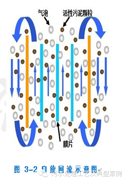 膜組件在生物反應(yīng)池中需要利用膜組件下部的曝氣作用在膜組件內(nèi)外形成自旋回流(如圖3-2 所示)。