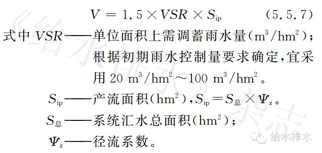 【條文5.5.7】在分流制排水區(qū)域,用于控制面源污染時,雨水調(diào)蓄池的有效容積,可按下列公式計算: