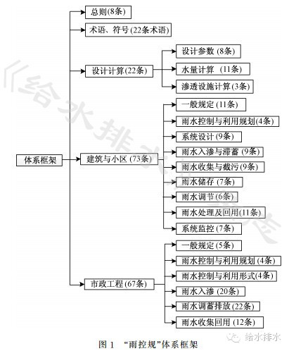 “雨控規(guī)”共分5章:1.總則;2.術(shù)語、符號;3.設(shè)計計算;4.建筑與小區(qū);5.市政工程,編制條文總數(shù)148條,其中強制性條文9條(第1.0.3、1.0.74.1.11、4.4.24.6.1、4.8.95.4.4、5.6.45.6.5條),體系框架見圖1