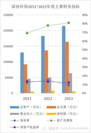 上圖為國禎環(huán)保近幾年的財務(wù)指標(biāo)變化趨勢。可以看出,企業(yè)規(guī)模在近幾年保持著較為穩(wěn)定的增長趨勢。其中總資產(chǎn)增長幅度較為明顯。