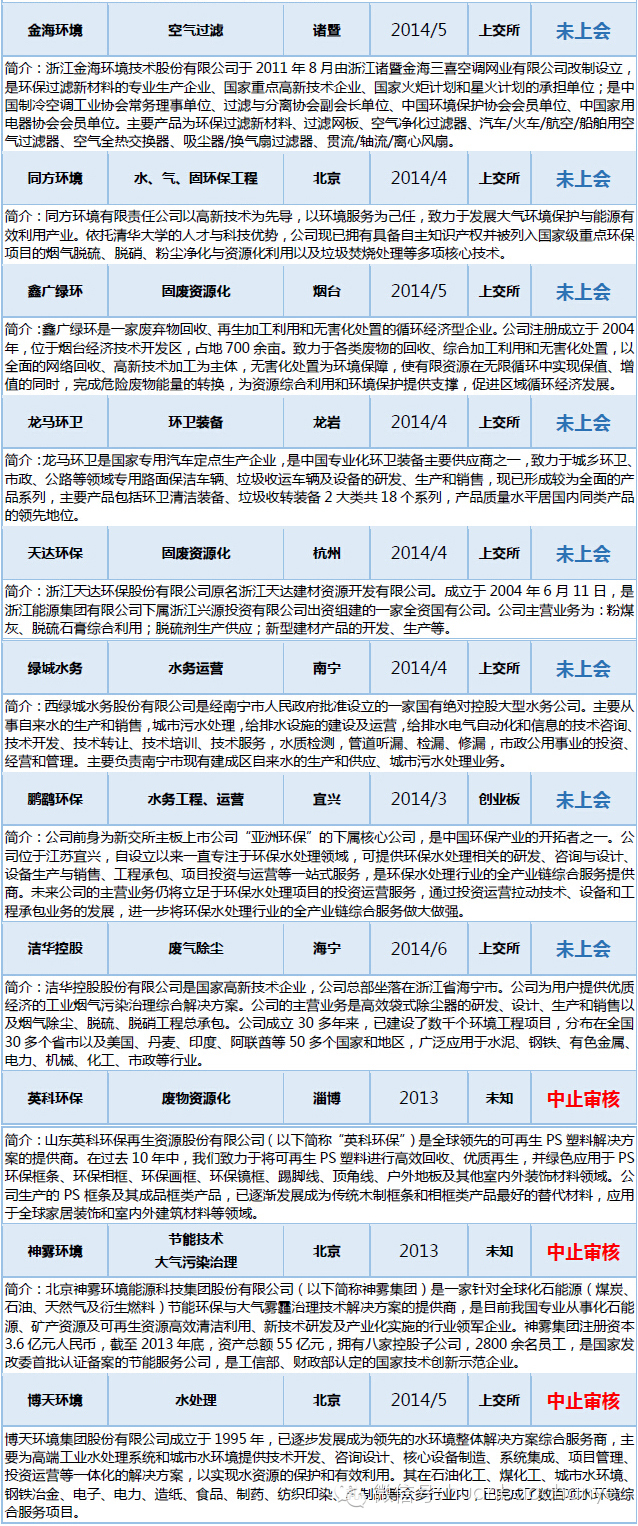 從審核的角度看。預(yù)披露的環(huán)保企業(yè)中目前還未上會審核的企業(yè)共16家,取消、中止或未通過審核的企業(yè)有3家(非完全統(tǒng)計),通過審核的企業(yè)共4家,如上文所述,共2家已上市,而另兩家尚在籌備狀態(tài)(高能時代已于29日獲得批準(zhǔn),中礦環(huán)保還在等待批文)。
