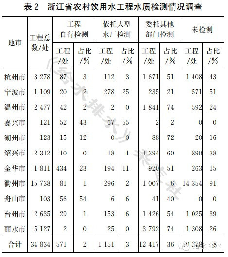 檢測(cè)能力弱。目前,全省 34834處農(nóng)村供水工程中,開(kāi)展水質(zhì)檢測(cè)14556處,占42%,其中規(guī)模以上即設(shè)計(jì)供水規(guī)模200 m3/d以上的工程1659處,檢測(cè)率89.2%。即,有20278處(占總數(shù)58%)供水工程沒(méi)有實(shí)行水質(zhì)檢測(cè)(見(jiàn)表2),其中99%為規(guī)模以下不具備自檢能力的鄉(xiāng)村小水廠。面廣量多的小規(guī)模鄉(xiāng)鎮(zhèn)級(jí)和村級(jí)供水工程不具有水質(zhì)檢驗(yàn)設(shè)備和檢驗(yàn)人員,甚至絕大多數(shù)縣沒(méi)有農(nóng)村飲用水工程的水質(zhì)檢測(cè)機(jī)構(gòu),委托衛(wèi)生、水文、城市水廠等部門(mén)檢測(cè)檢驗(yàn),或是力量不足就是經(jīng)費(fèi)沒(méi)有保障。水質(zhì)檢測(cè)缺位、經(jīng)費(fèi)投入缺乏、監(jiān)督制度缺失,不能及時(shí)掌握農(nóng)村飲用水水質(zhì)狀況,不能及時(shí)發(fā)現(xiàn)并消除飲水安全隱患。