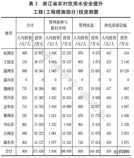 分析不同區(qū)域不同類別的典型工程實(shí)例,結(jié)合前階段浙江省農(nóng)村飲水安全工程建設(shè)投資水平,經(jīng)綜合測(cè)算,各類工程的單位投資分別為(見(jiàn)表3):①城鎮(zhèn)管網(wǎng)延伸和聯(lián)村并網(wǎng)工程1050元/人;②管網(wǎng)改造工程700元/人;③制水工藝改造工程450元/人;④水質(zhì)檢測(cè)能力保障工程200萬(wàn)元/中心;⑤農(nóng)村飲水達(dá)標(biāo)工程50萬(wàn)元/年/縣。除水質(zhì)檢測(cè)能力保障工程涉及檢測(cè)中心建設(shè),約用地25畝,其他項(xiàng)目不涉及土地使用指標(biāo)。實(shí)施農(nóng)村飲水安全提升“五項(xiàng)”工程,初步估算總投資39.8億元,年均投資5.6億元。