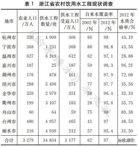 2001年底,全省有1360多萬(wàn)農(nóng)村人口仍以淺井、引泉、集雨等傳統(tǒng)方式取水,其中有300萬(wàn)人一般干旱年就飲水困難。為加快改變這一狀況, 2003年經(jīng)浙江省委、省政府決策,在全國(guó)率先啟動(dòng)了以自來(lái)水進(jìn)村入戶為標(biāo)準(zhǔn)、以實(shí)現(xiàn)農(nóng)村飲水安全為目標(biāo)的“千萬(wàn)農(nóng)民飲用水工程”。該工程實(shí)施以來(lái),浙江省農(nóng)村飲水工作取得長(zhǎng)足進(jìn)展。十年間,累計(jì)完成農(nóng)村供水工程投資132.7億元,解決和改善1860多萬(wàn)農(nóng)村人口和60多萬(wàn)農(nóng)村學(xué)校師生的飲用水條件。至2012年,浙江省農(nóng)業(yè)人口3279萬(wàn)人,累計(jì)建有農(nóng)村集中供水工程34834處,受益人口3177萬(wàn)人,其中:城鎮(zhèn)管網(wǎng)延伸工程761處,受益口1417萬(wàn)人;鄉(xiāng)鎮(zhèn)(聯(lián)村)供水工程909處,受益668萬(wàn)人;單村供水工程33164處,受益1092萬(wàn)人。全省農(nóng)村自來(lái)水覆蓋率從2002年的62.6%提高到2012年的97%(見(jiàn)表1)。