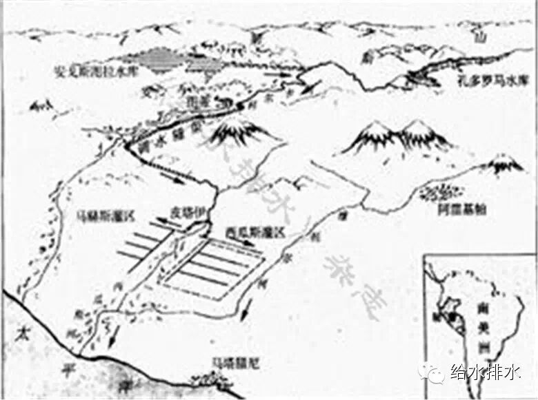 馬赫斯調(diào)水工程醞釀多年1971年開工建設。規(guī)劃調(diào)水工程在安第斯山區(qū)建兩座水庫作為調(diào)水水源:①在科爾卡河上建孔多羅馬水庫,大壩高100米,壩頂高程4185米,庫容285億立方米,用于調(diào)節(jié)科爾卡河徑流。②在亞馬孫河水系上游的阿布里克河上修建安戈斯圖拉水庫,壩高105米,壩頂高程4180米,庫容10億立方米,通過17千米長的隧洞和明渠將大西洋水系阿布里克河水調(diào)入太平洋水系的科爾卡河。然后通過89千米隧洞和12千米明渠,將水調(diào)入西瓜斯河。而后利用約2000米落差建兩座水電站,為阿雷帕省等地供電,發(fā)電尾水進入西瓜斯河,用于發(fā)展灌溉。