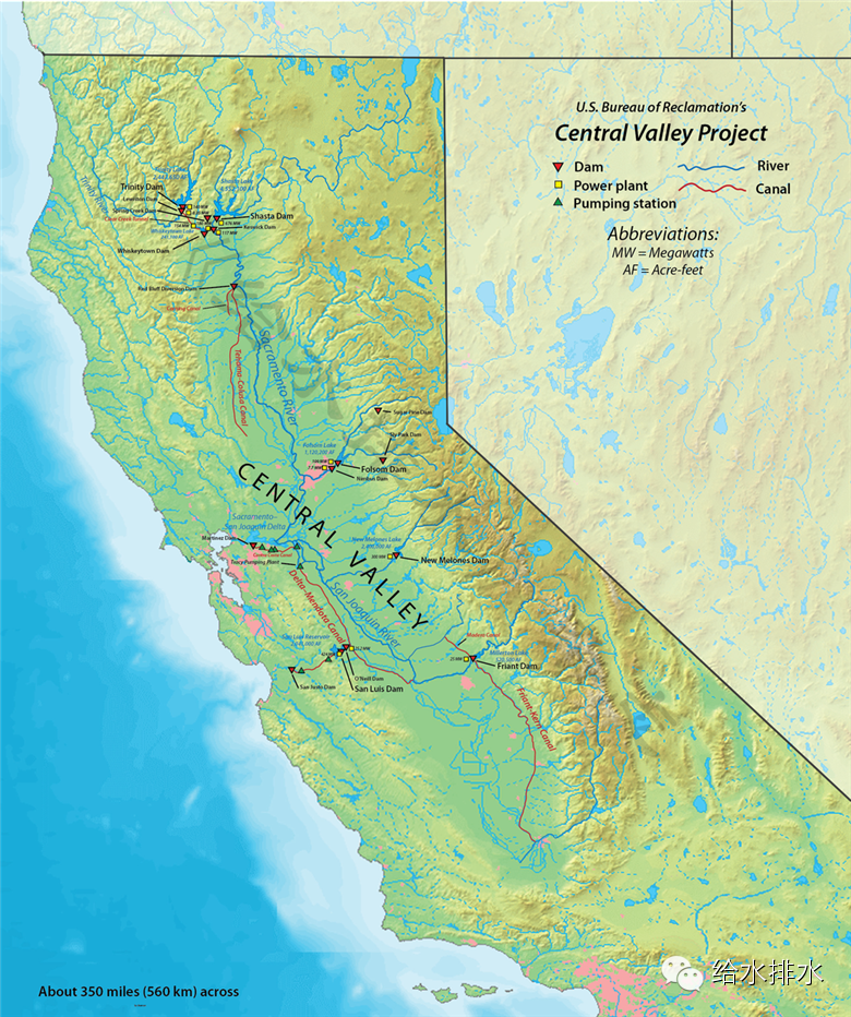 興建中央河谷工程的主要目的是將河谷北部薩克拉門托河的多余水量調(diào)至南部的圣華金流域,在水源充足的河谷北部薩克拉門托河上游興建沙斯塔水庫,將汛期多余的洪水攔蓄起來,在灌溉季節(jié)將水經(jīng)薩克拉門托河下泄至薩克拉門托圣華金三角洲,經(jīng)三角洲橫渠過三角洲到南部的特雷西泵站,經(jīng)該泵站將水分成兩股,一股入康特拉-科斯塔渠輸水到馬丁內(nèi)斯水庫,向舊金山地區(qū)供水,另一股通過三角洲門多塔渠流入弗里恩特水庫,最后通過弗里恩特-克恩渠把水調(diào)向南部更缺水的圖萊里湖內(nèi)陸河流域。