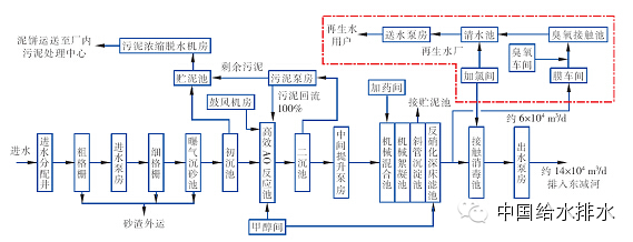 本工程主要內(nèi)容及建設(shè)規(guī)模如下:污水廠、再生水廠分別為遠(yuǎn)期48萬(wàn)噸/天、15萬(wàn)噸/天,一期規(guī)模分別為20萬(wàn)噸/天、6萬(wàn)噸/天,污泥處理處置規(guī)模為300 t/d。污水廠采用AO脫氮除磷/反硝化深床濾池工藝,再生水廠采用雙膜法/臭氧脫色工藝,污泥處理處置采用好氧發(fā)酵技術(shù)。