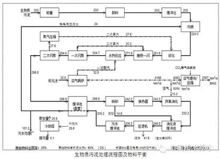 下面是物料平衡圖,把它叫做水熱改性+厭氧消化工藝組合,其實(shí)這里面還有很多設(shè)備,尤其是壓濾脫水機(jī)是一個(gè)非常重要的設(shè)備。這是按200噸的規(guī)模折算成80%的含水率計(jì)算的。尤其是泥餅的產(chǎn)量和有機(jī)質(zhì)是有關(guān)系的,是45%。這樣200噸污泥進(jìn)來以后,能夠剩下這么一些東西,大約是42噸泥餅,含水率大部分都在50%以下。另外還產(chǎn)生8000m3的沼氣,燒掉了一半,剩下一半,有可能多有可能少,但是可保證工藝的原料。另外還有一個(gè)產(chǎn)品,就是大約180噸濾液,即尾水,這個(gè)如果在污水處理廠就好辦一些,在這里需要一些成本來處理。因?yàn)槲覀兪亲隼鴿B液的處理有一些辦法。我們解決了燃燒的問題,還需要一些水和電。