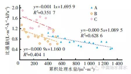 1.3 MBR工程季度平均比通量隨單位膜面積累積產(chǎn)水量的變化趨勢