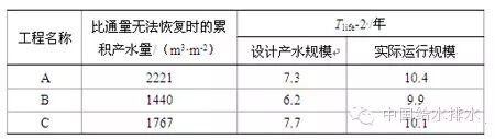 根據(jù)MBR工程的實(shí)際運(yùn)行經(jīng)驗(yàn),認(rèn)為當(dāng)平均比通量降低至0.2 L/m2·h·kPa)時,MBR工程難以維持穩(wěn)定運(yùn)行,因此可以粗略地認(rèn)為膜已達(dá)到使用壽命。根據(jù)這一預(yù)測標(biāo)準(zhǔn)和擬合方程,估算出3MBR工程膜壽命終結(jié)時的單位膜面積累積產(chǎn)水量。再根據(jù)各工程的產(chǎn)水量和膜面積,預(yù)測得到設(shè)計(jì)產(chǎn)水規(guī)模及實(shí)際產(chǎn)水規(guī)模下的膜壽命如表3所示。