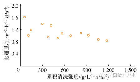 膜的滲透性隨累積清洗強(qiáng)度增大有明顯下降的趨勢,可能存在最大累積清洗強(qiáng)度,可作為膜壽命終結(jié)的另一重要依據(jù),并對清洗方案的優(yōu)化有實(shí)用意義。