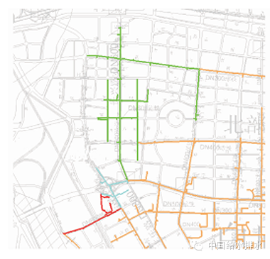 為驗(yàn)證前期試驗(yàn)結(jié)果,以鄭州市現(xiàn)狀水力模型為基礎(chǔ),對(duì)軟件水力追蹤和水質(zhì)模擬功能進(jìn)行開(kāi)發(fā)及應(yīng)用,通過(guò)對(duì)管網(wǎng)污染物入侵源頭追蹤、擴(kuò)散方式模擬、影響范圍預(yù)測(cè)等方面進(jìn)行研究,制定開(kāi)關(guān)閥門、調(diào)流調(diào)壓、管網(wǎng)放水等一系列措施,完善控制預(yù)案,提高應(yīng)急能力,為公司規(guī)范和完善管網(wǎng)施工、維護(hù)、檢修等系列工作流程,及制定相應(yīng)管理規(guī)定提供技術(shù)支持。兩條管段碰頭后,興隆鋪管段中的水流方向發(fā)生了改變,可能會(huì)使管垢中的沉積物被沖起而導(dǎo)致下游管段的水體污染。以沙口路—興隆鋪路節(jié)點(diǎn)為污染源,預(yù)測(cè)污染物擴(kuò)散區(qū)域,結(jié)果見(jiàn)圖5?芍摴(jié)點(diǎn)的污染源擴(kuò)散影響區(qū)域和事故區(qū)域大致吻合。對(duì)污染物擴(kuò)散路徑及時(shí)間進(jìn)一步模擬,結(jié)果表明,污染水體沿著興隆鋪路—南陽(yáng)路—北三環(huán)—長(zhǎng)興路進(jìn)行擴(kuò)散,從起點(diǎn)興隆鋪路與沙口路交口開(kāi)始,經(jīng)4 h后到達(dá)南陽(yáng)路,8 h后到達(dá)長(zhǎng)興路,而后進(jìn)入居民較為集中的區(qū)域,16 h后擴(kuò)散區(qū)域基本穩(wěn)定。