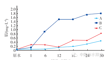 13種管材浸泡水中鋁含量的變化趨勢(shì)?梢钥闯,浸泡1 d后,A、BC管材浸泡水中的鋁含量分別為0.055、0.144、0.266 mg/L;隨著浸泡時(shí)間的增加,3種管材浸泡水都存在不同程度的鋁溶出加劇現(xiàn)象,B管材最嚴(yán)重,C管材次之,A管材相對(duì)溶出最少。