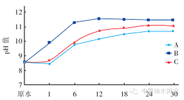 23種管材浸泡水的pH值變化情況。可知,浸泡1 d后,A、B、C管材浸泡水的pH值分別為8.46、9.92、8.71A、C管材基本滿足《生活飲用水輸配水設(shè)備及防護(hù)材料的安全性評(píng)價(jià)標(biāo)準(zhǔn)》的要求(不改變pH值),B管材不滿足標(biāo)準(zhǔn)要求;隨著浸泡時(shí)間的增加,3種管材浸泡水的pH值都急劇升高,浸泡12 d后趨于平緩,但3種管材均超標(biāo),其中B管材浸泡水的pH值增加量最大,為3.02。