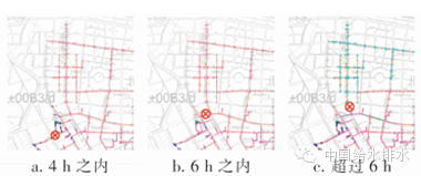 由圖7可知,在不同的擴(kuò)散階段,采用不同的控制位置。在事故發(fā)生4 h之內(nèi)進(jìn)行控制,則主要發(fā)生在輸水管,此時(shí),只需要進(jìn)行閥門控制,放掉污染水,即可避免進(jìn)入用戶,下游區(qū)域用水可通過(guò)北三環(huán)輸水管由中法水廠供給,用水可不受影響。如果超過(guò)4 h且在6 h之內(nèi),用水會(huì)到達(dá)部分用戶家里,但此時(shí)并未有大面積擴(kuò)散,在圖示位置進(jìn)行閥門控制,結(jié)合消火栓放水,也可有效控制污染水?dāng)U散,使下游用水不受影響。當(dāng)超過(guò)6 h之后,用水?dāng)U散至長(zhǎng)興路,此時(shí)再進(jìn)行閥門控制,則會(huì)阻斷北環(huán)輸水管向下游區(qū)域供水,造成下游區(qū)域的停水事故,因此,只能通過(guò)管網(wǎng)末端的消火栓放水措施來(lái)進(jìn)行污染水的處理。
