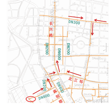 根據(jù)水力模型的模擬結(jié)果,可針對(duì)性地制定一系列控制措施。分析事故區(qū)域的管網(wǎng)情況,該區(qū)域輸水管為一條DN600管道,配水管網(wǎng)則以DN200管為主,用水量約為1.4×104 m3/d,用水量較小,以居民用水為主。該區(qū)域管網(wǎng)情況及流向見(jiàn)圖6。
