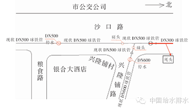 管網(wǎng)水質(zhì)出現(xiàn)白濁問(wèn)題期間,恰逢該市京沙快速路全線改造,自來(lái)水公司對(duì)沙口路沿線進(jìn)行了一系列的管網(wǎng)施工。選取距離問(wèn)題區(qū)域最近的一組施工碰頭進(jìn)行分析,如圖4所示?梢钥闯觯晨诼放c興隆鋪路交叉口以北區(qū)域的一段DN300管段為枝狀管網(wǎng)末梢,容易產(chǎn)生死水區(qū)域。從7月底施工結(jié)束到814碰頭通水,末梢存水的停留時(shí)間超過(guò)15 d。兩條管段碰頭后,興隆鋪管段水流方向發(fā)生了改變,沙口路北部末端死頭水可能進(jìn)入管網(wǎng),污染水質(zhì)隨水流擴(kuò)散,進(jìn)入用戶龍頭。通過(guò)查詢施工報(bào)告,確定此DN300管段全長(zhǎng)為500 m,所用管材正是上述浸泡試驗(yàn)中管道內(nèi)壁物質(zhì)溶出最顯著的B管材。由此推斷該區(qū)域管段經(jīng)長(zhǎng)時(shí)間浸泡后,管材內(nèi)壁溶出的金屬離子和堿性物質(zhì)正是此次管網(wǎng)水質(zhì)白濁問(wèn)題的污染源。