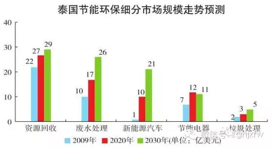 泰國節(jié)能環(huán)保市場細(xì)分領(lǐng)域中,資源回收產(chǎn)業(yè)市場規(guī)模將由2009年的22億美元增至2020年的27億美元;廢水處理市場規(guī)模將由2009年的10億美元增至2020年的17億美元;新能源汽車市場規(guī)模將由2009年的1億美元增至2020年的10億美元。